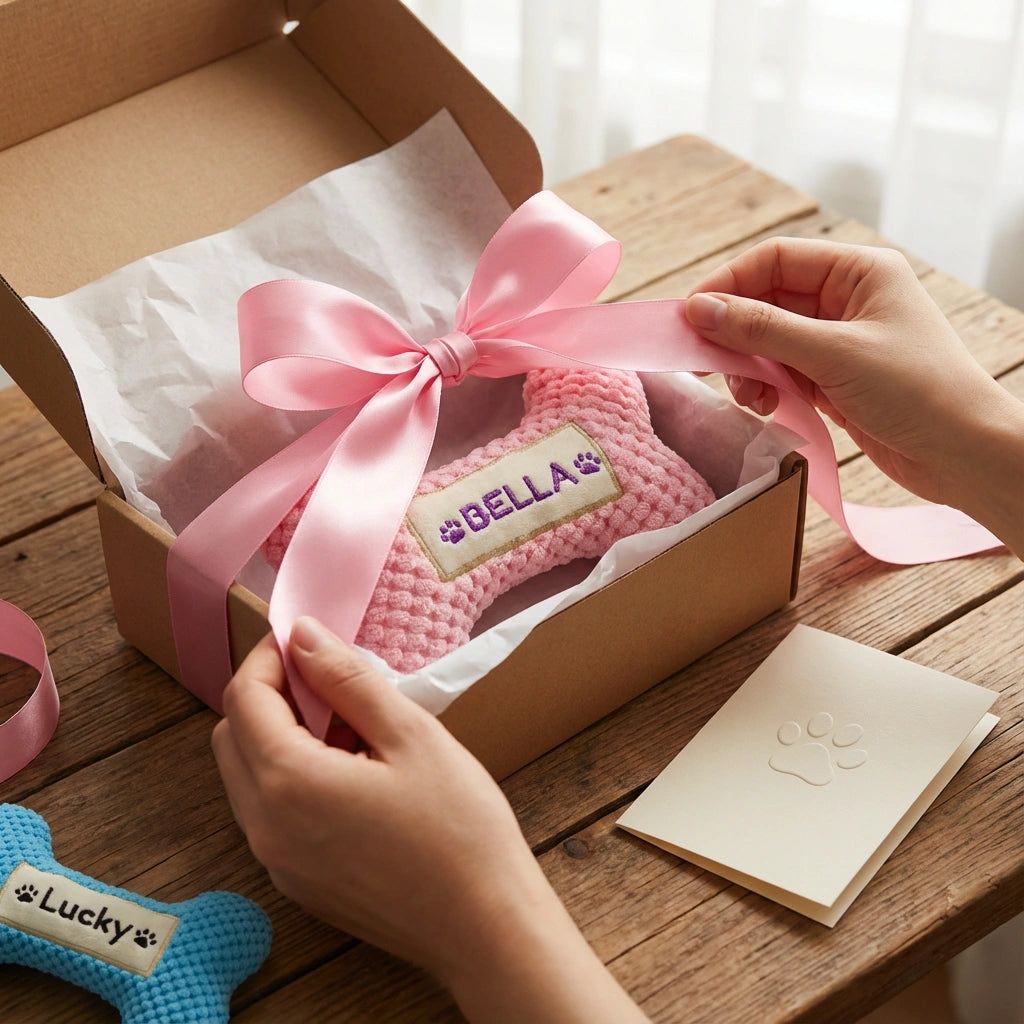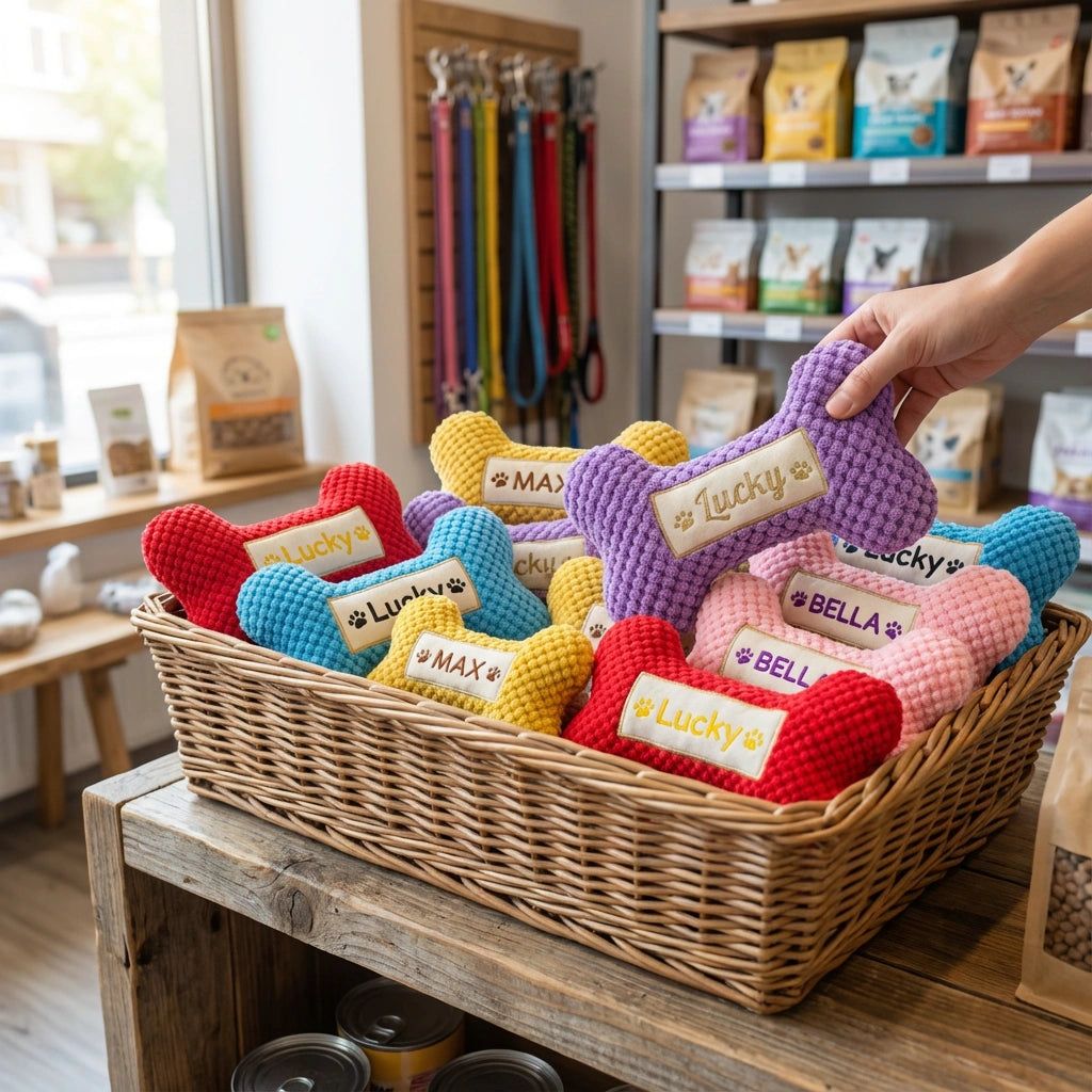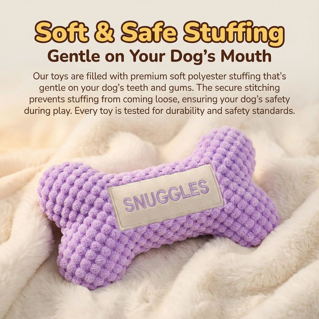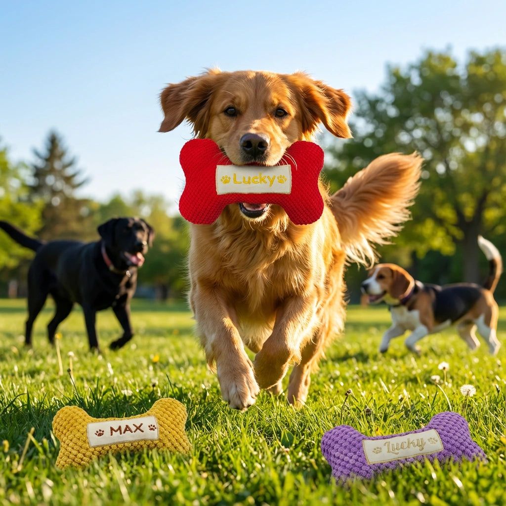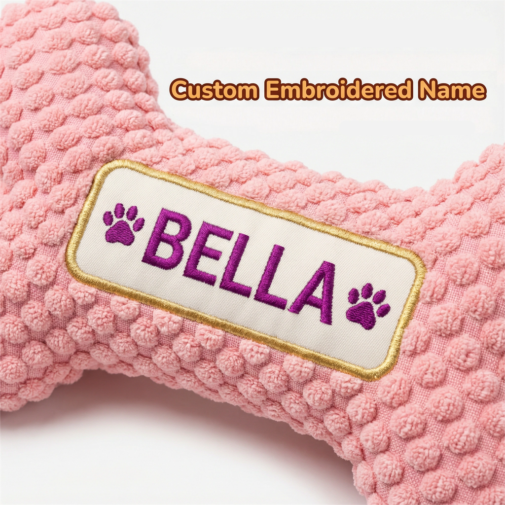 A Personalized Squeaky Toy That Puts Your Dogs Name Front and Center Give your dog a toy thats just as special as they are. This personalized dog bone squeaky toy combines durable construction with cozy comfort and custom embroidery, making it a favorite for both pets and pet parents.