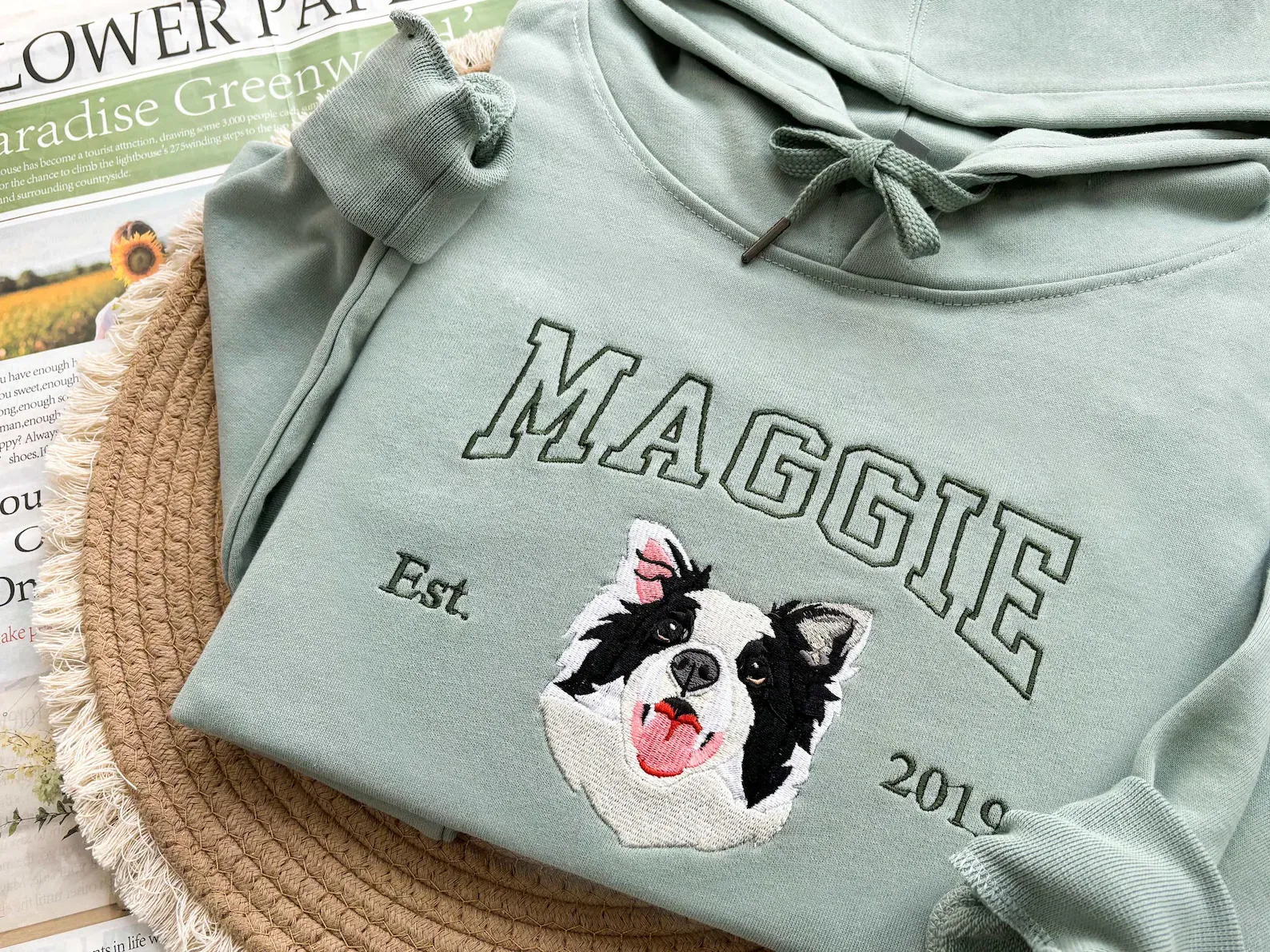 Celebrate your beloved companion in the most unique way – with a full color embroidered portrait you can wear close to your heart. Our sweatshirts transform your favorite photo of your dog, cat, or horse into a vibrant, lifelike embroidery, complete with their name, special date, or meaningful phrase.