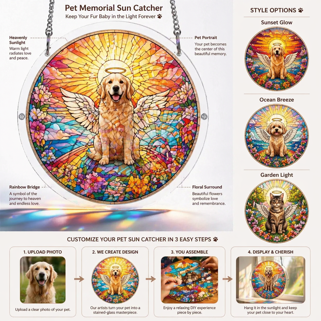 Turn your pet’s memory into something truly beautiful. This personalized acrylic sun catcher features a unique puzzle-style design, transforming your pet’s photo into a radiant stained-glass artwork that shines with love every time sunlight passes through.