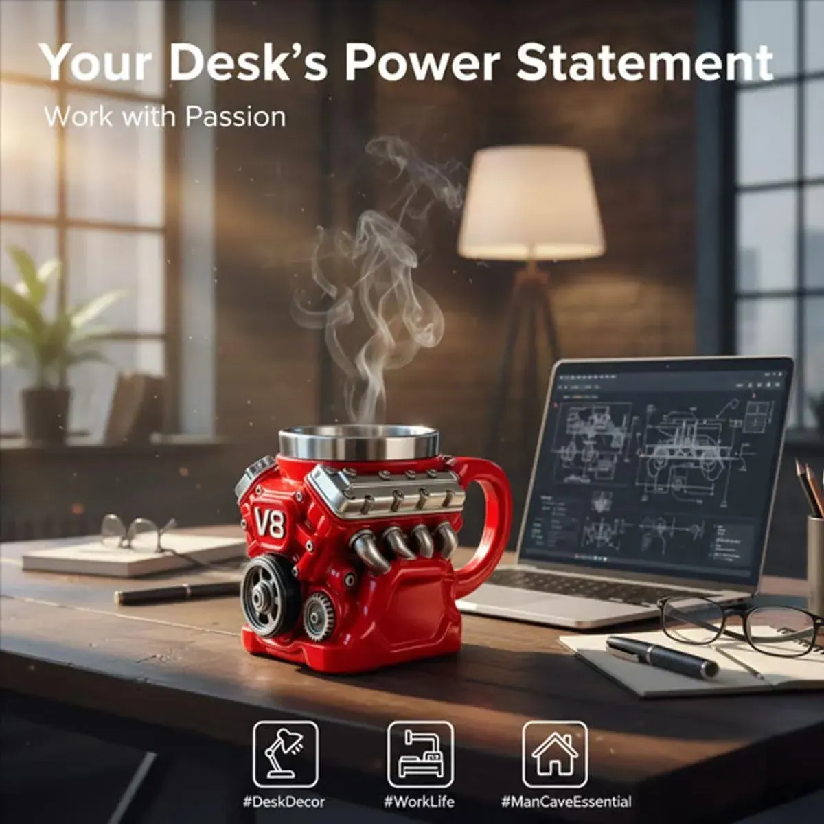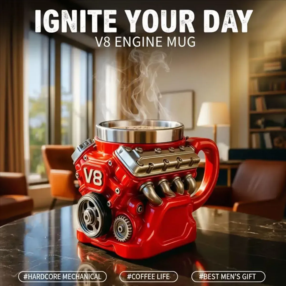 Featuring a striking V8 engine design, this mug combines bold aesthetics with practical safety. For your safety, it is not equipped with a high-temperature steam ejection function, ensuring you can enjoy your hot drinks without any risks.